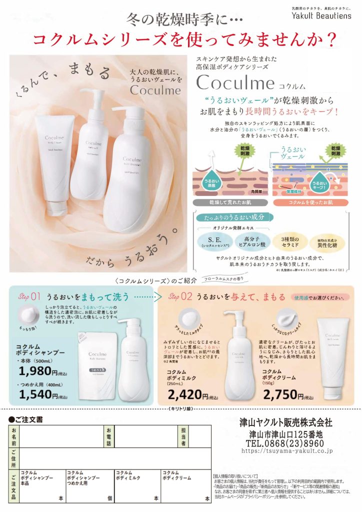 また、大人の乾燥肌に向けた高保湿ボディケアシリーズ Coculme(コクルム)もおすすめです。